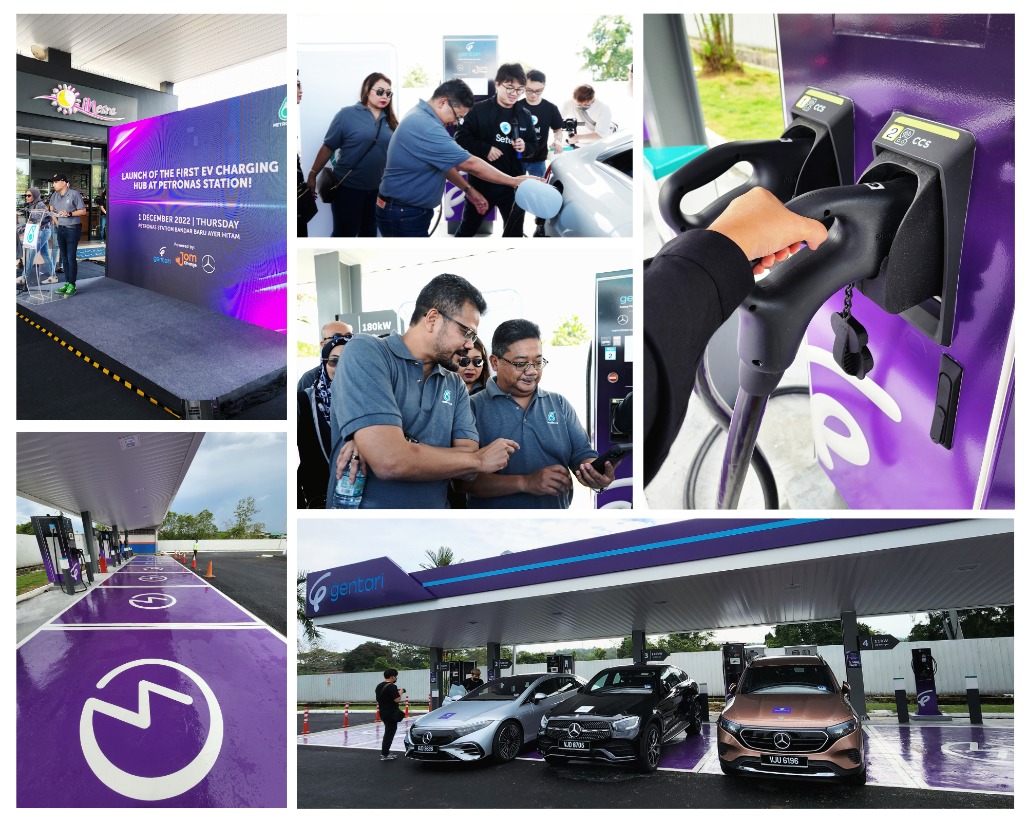KUALA LUMPUR, 2 December 2022 – PETRONAS Dagangan Berhad (PDB) recently launched its first electric vehicle (EV) charging hub at PETRONAS Station Bandar Baru Ayer Hitam along the North-South Expressway (NSE), marking the completion of key milestones under its collaboration with Mercedez-Benz Malaysia Sdn Bhd and EV Connection Sdn Bhd which started November last year.