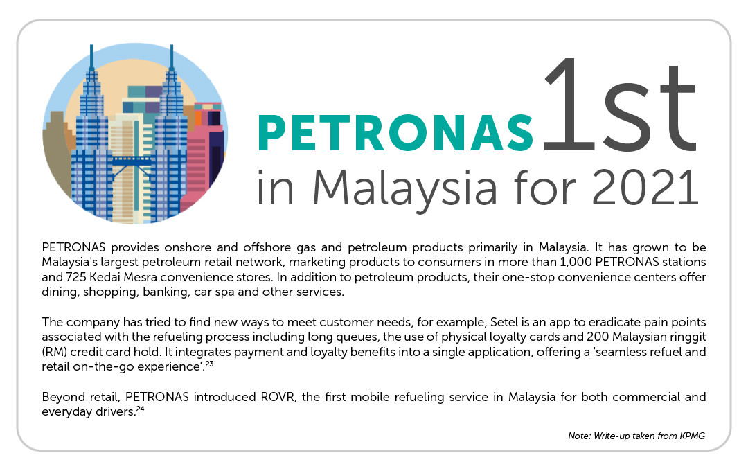 PETRONAS has topped this year's rankings in customer experience excellence. In addition to quality fuel products, differentiated services and one-stop convenience centers that offer dining, shopping, banking and many more, we go the extra mile to curate enjoyable customer experience that is unique to PETRONAS. As a progressive energy and solutions partner, we envision what our customers’ journey would look like, identify their pain points and help iron out any bumps along the way.